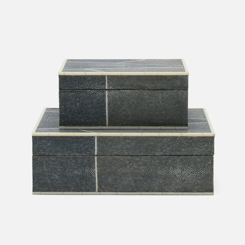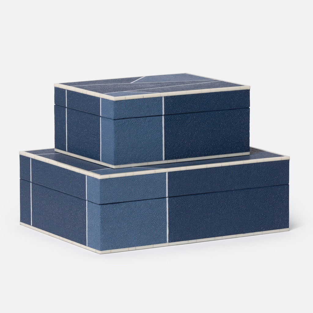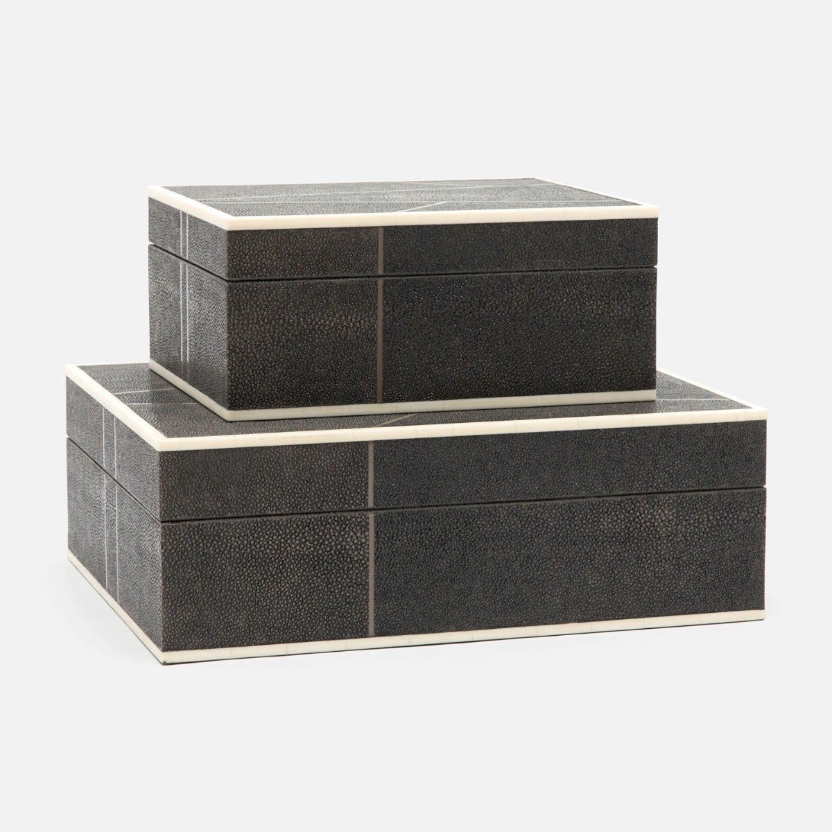 Hinged box featuring geometric faux-shagreen panels trimmed with bone like resin. Interior fully lined in cream velvet. SET OF 2.