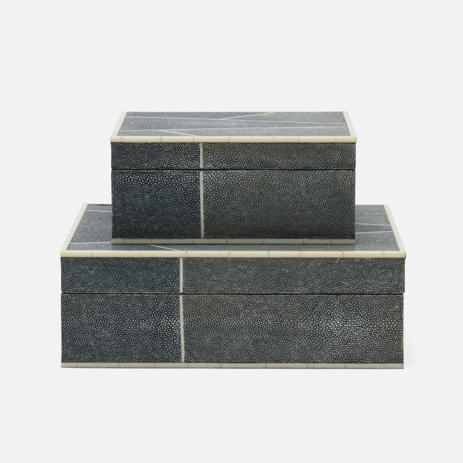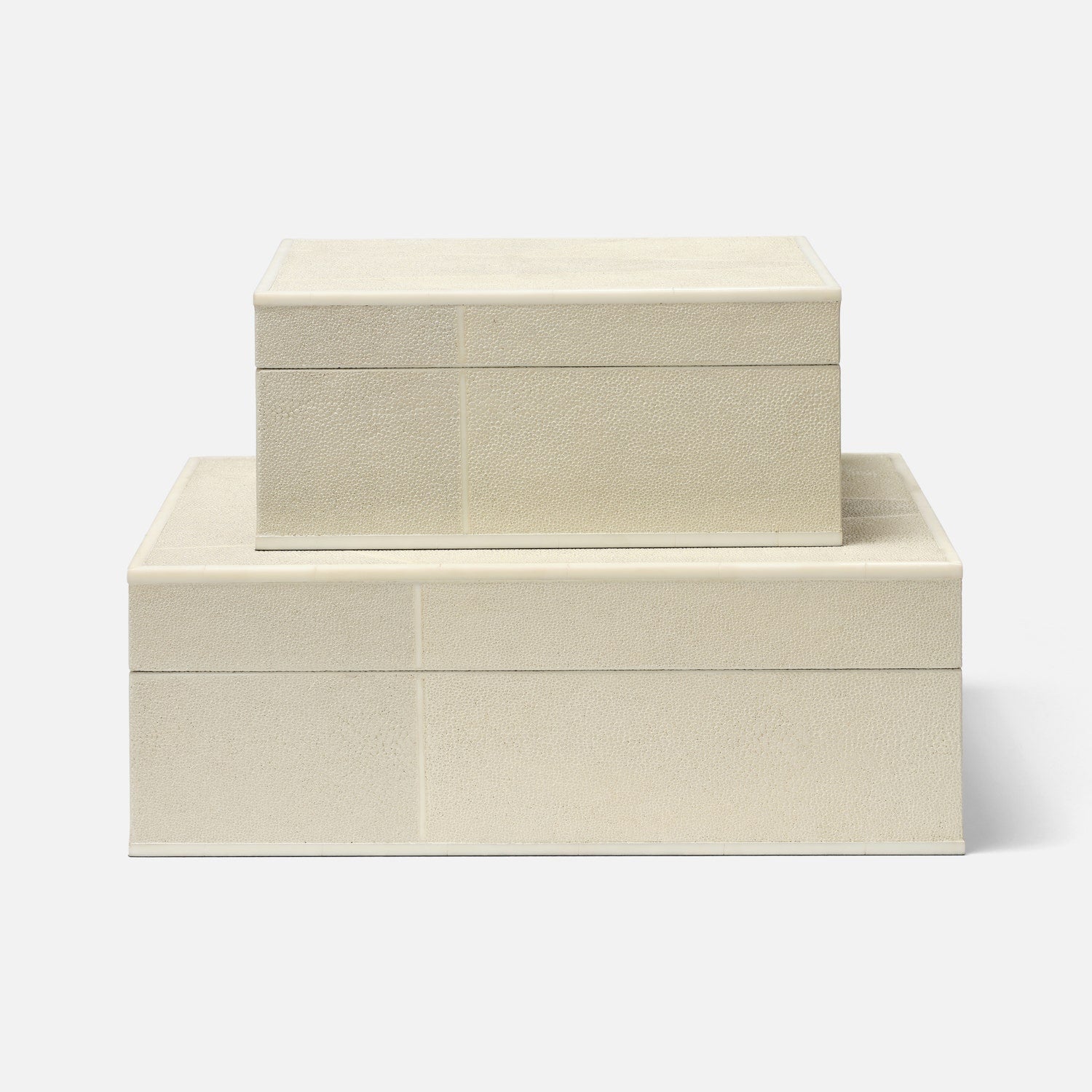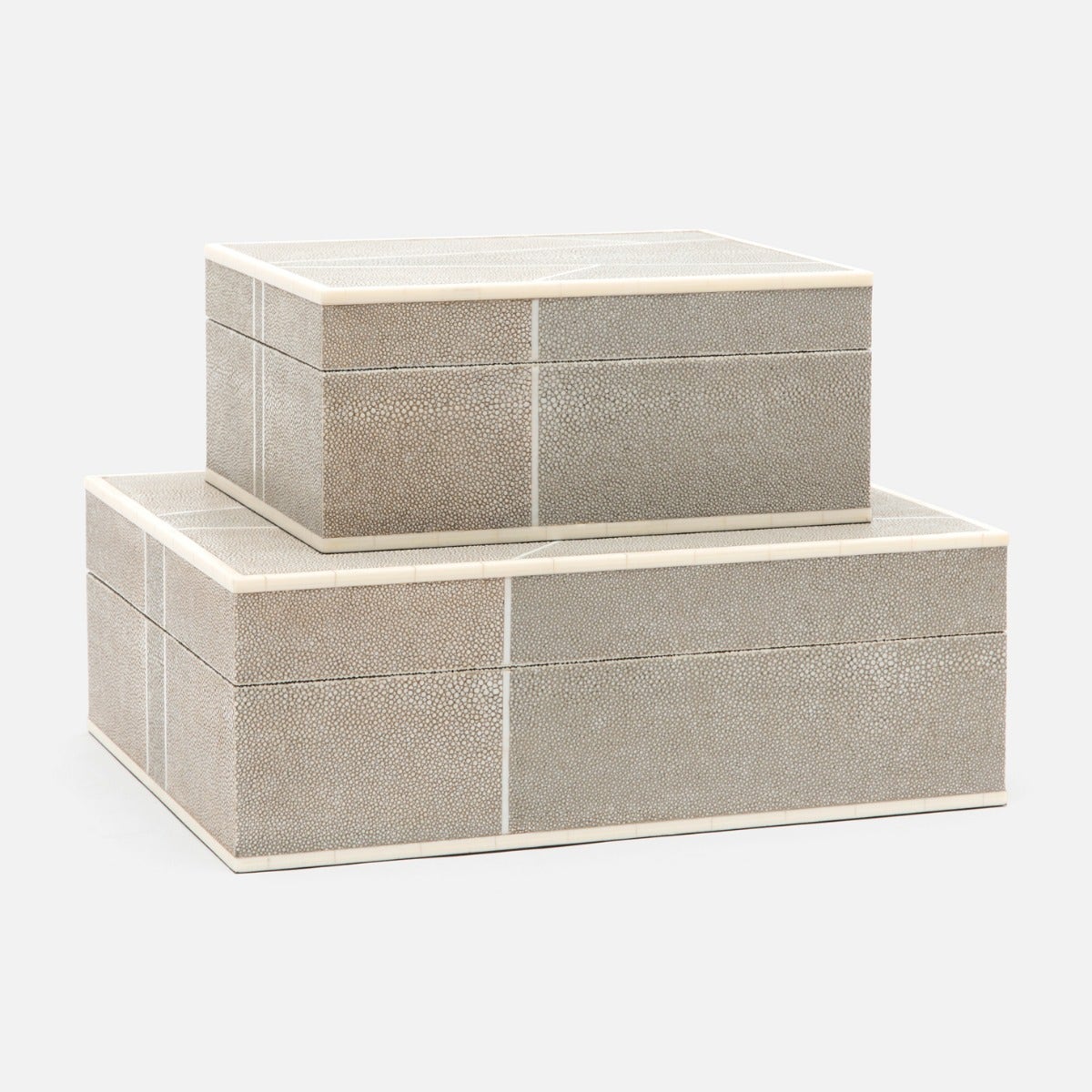 Hinged box featuring geometric faux-shagreen panels trimmed with bone like resin. Interior fully lined in cream velvet. SET OF 2.