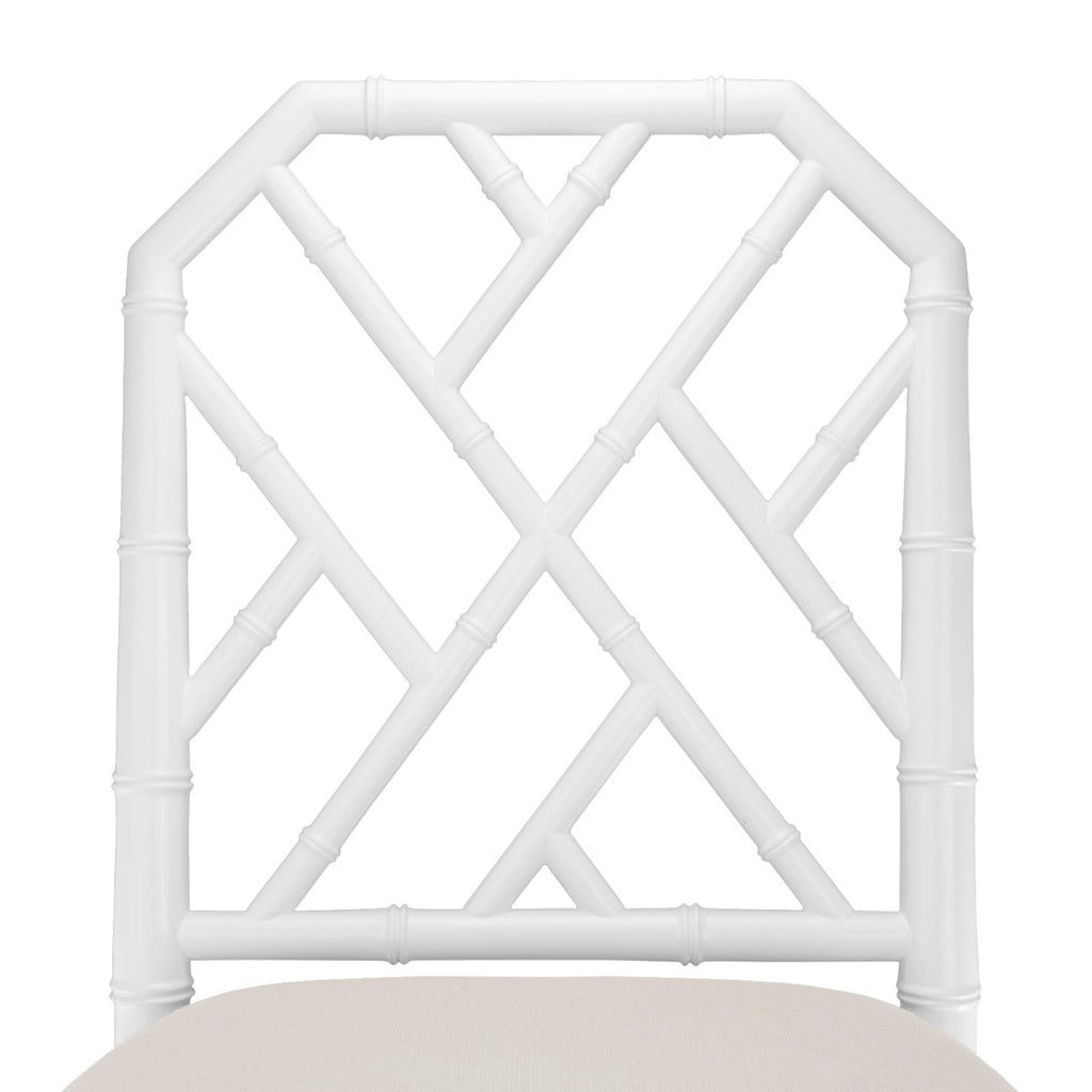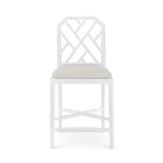 Inspired by classic Chinoiserie, the Jardin Counter Stool brings relaxed elegance to any setting. Crafted from hand-carved solid mahogany with a rich eggshell white lacquer, its bamboo-style frame, lattice fretwork, and tapered legs offer timeless charm. A natural linen drop-in cushion adds comfort and sophistication, making it an ideal perch for kitchen islands or home bars.