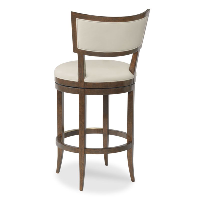 Sleek and sophisticated, this swivel bar stool combines comfort with timeless design. It features a curved crest rail with welted ivory leather upholstery, paired with a plush seat for added support. The stool rests on tapered saber legs, offering a graceful silhouette, while the memory swivel mechanism ensures smooth movement and easy return.