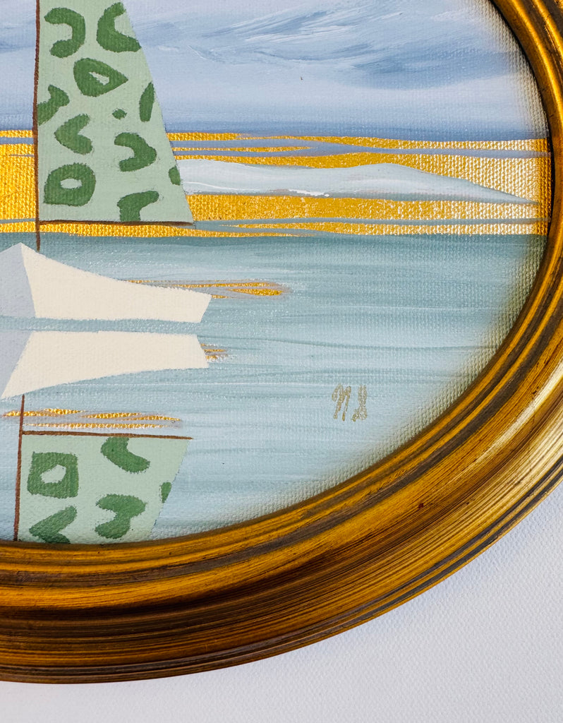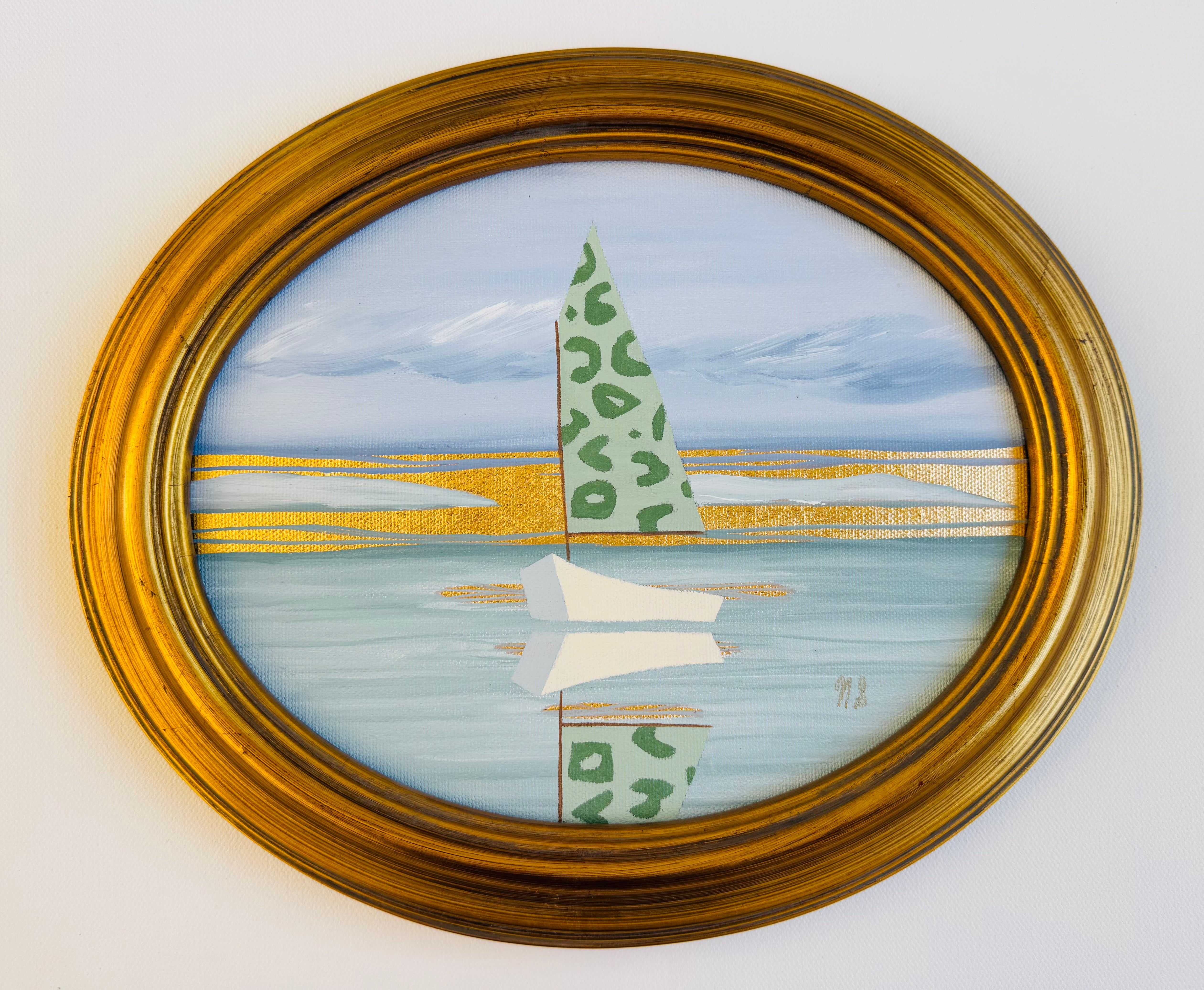 Materials: Oil, acrylic, and 24K gold leaf on canvas framed in a gold oval.