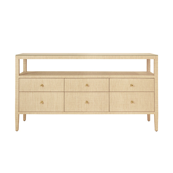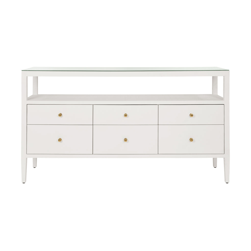 Elegant and functional, this six-drawer console features an open shelf for versatile storage and display. The glass top adds a sleek, modern touch, while polished brass knobs bring subtle sophistication to the design. Its spacious drawers keep essentials organized, making it ideal for entryways, living rooms, or dining areas.
