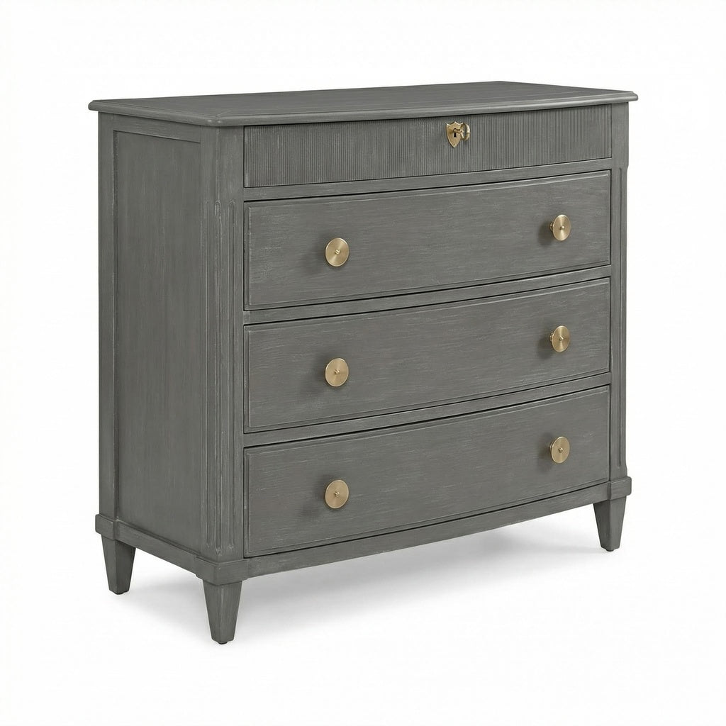 The Bishop Painted Chest combines classic proportions with a modern painted finish, making it a versatile addition to any bedroom or living space. Crafted from hardwood solids and veneers, this piece features clean lines and elegant brass hardware for a timeless look.
