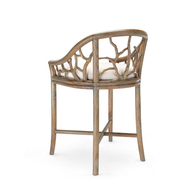 Bring woodland charm into any setting with the Bosco Counter Stool, an artful twist on classic French faux bois design. Hand-carved from solid Cape Lilac Mahogany, its intricate twig-like silhouette is finished in a light driftwood tone that highlights its organic texture. A plush, woven linen drop-in cushion adds comfort and sophistication, making it a perfect fit for country cottages, coastal homes, or urban retreats.