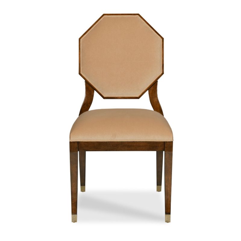 Blending classic elegance with modern lines, this transitionally styled side chair features a distinctive hexagon-shaped upholstered back and a plush seat, both detailed with welt trim. Crafted from hardwood solids, it rests on graceful tapered saber legs accented with brass sabots, adding a subtle touch of sophistication.