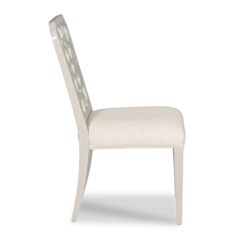 This elegant side chair features a finely crafted pierced fretwork back paired with a welted upholstered seat, offering both visual interest and comfort. Made from hardwood solids, the chair stands on graceful tapered legs, making it a timeless choice for dining rooms or accent seating.