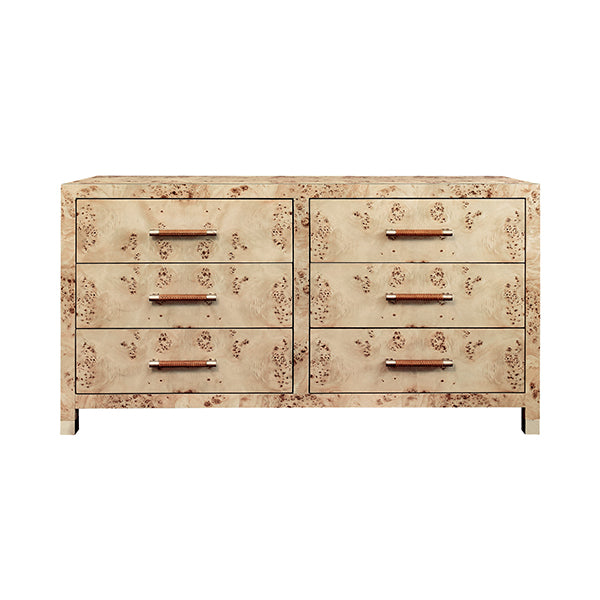 Gorgeous, six drawer chest with rattan wrapped handles. Available in natural grasscloth or white lacquer.