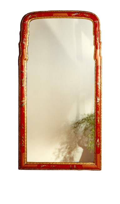 Exquisitely hand-painted in raised silver and gold chinoiserie on an antique red ground, this mirror features a hand-gilded antique gold leaf border. Also available in black or green grounds, with an optional beveled mirror crafted in true Queen Anne style with a traditional seam below the crest.