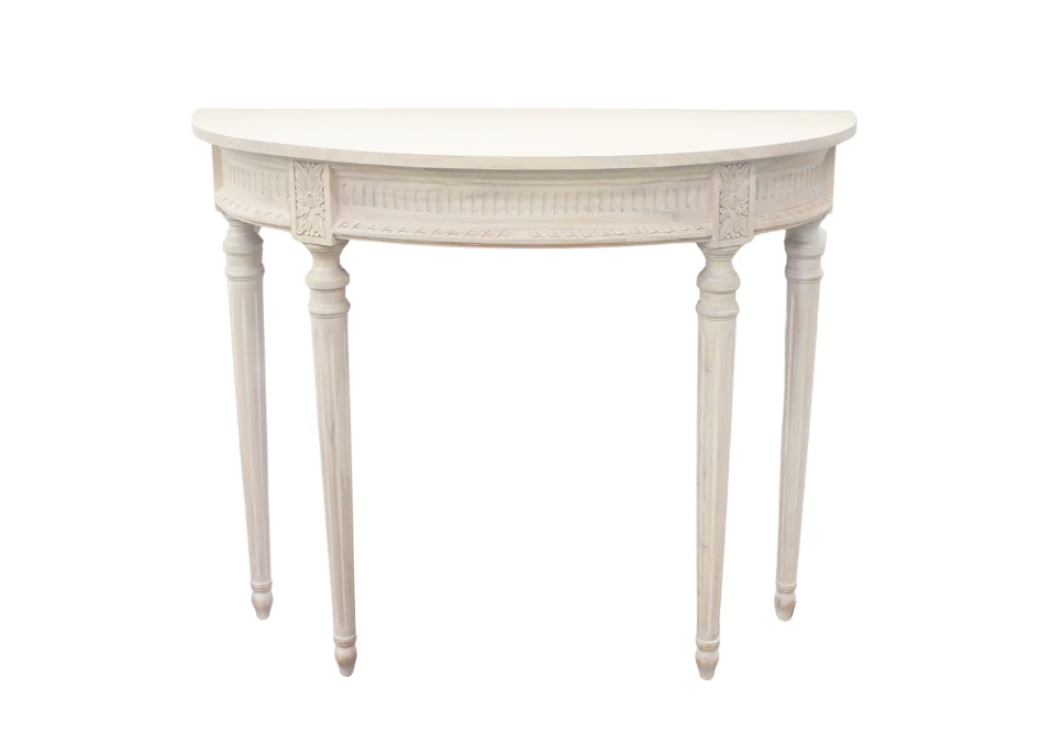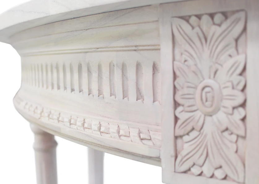A fresh take on one of our best-selling designs, the Camille Demilune in a white washed finish brings a soft, tonal look to this timeless silhouette. Inspired by neoclassical design, it features delicately hand-carved floral motifs and fluted legs that offer a refined, graceful presence.