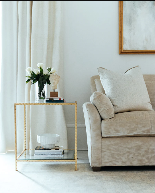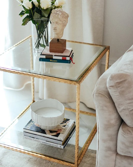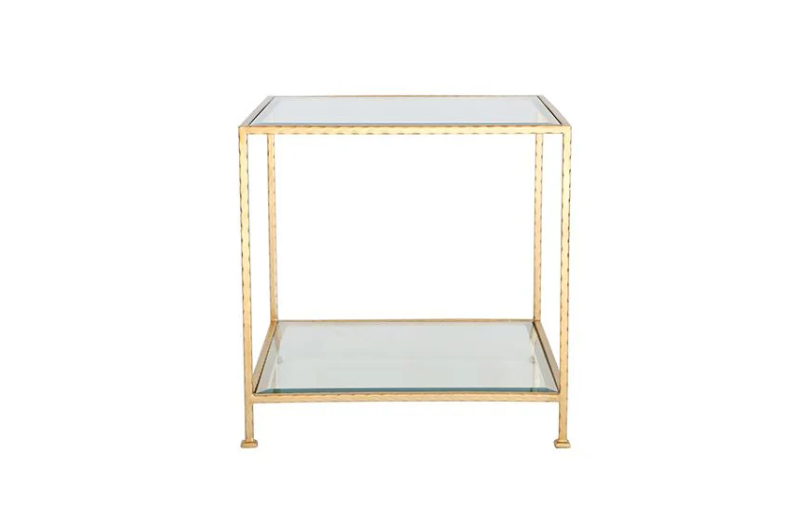 Classic style and clean lines define this delicate table. The Chloe End Table features a hand-applied gold leaf finish, scalloped metal detail, and beveled glass. The bottom shelf is the perfect place to display your favorite books and decorative items.