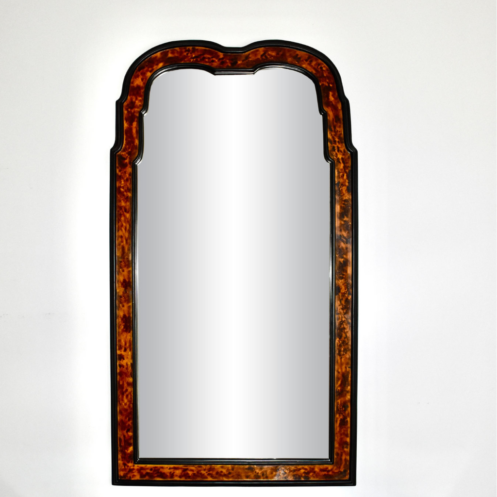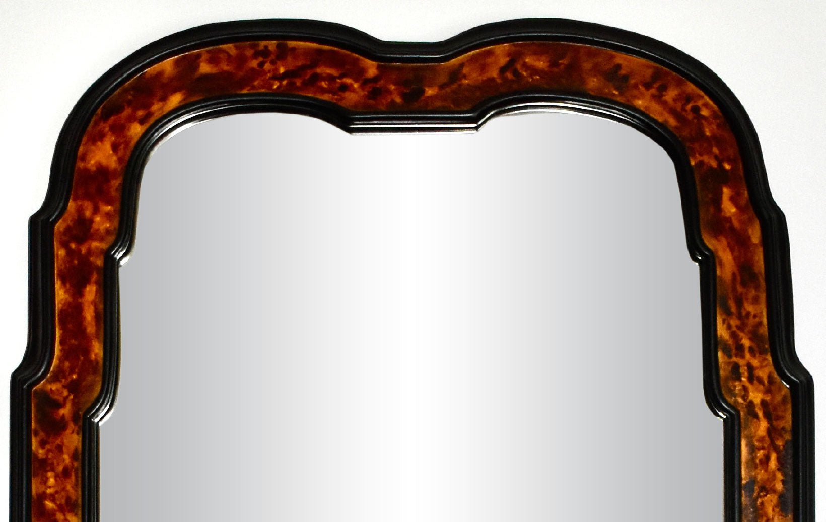 The Stately Queen Anne mirror looks elegant in a classic traditional interior but also a fun surprise in a more modern environment. The rich finish is a hand painted unusual Burled Tortoise Shell set deeply in a contrasting black ogee surround. The shape of the mirror frame is Queen Anne at it finest. Carol Canner designer.