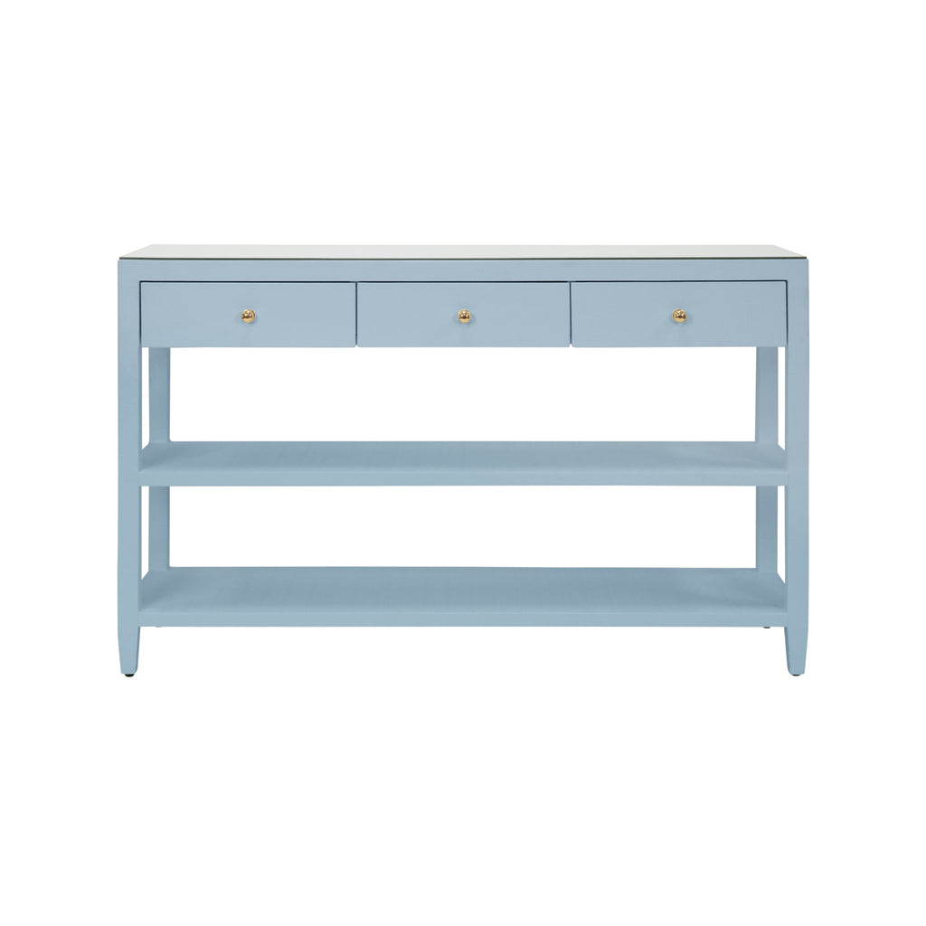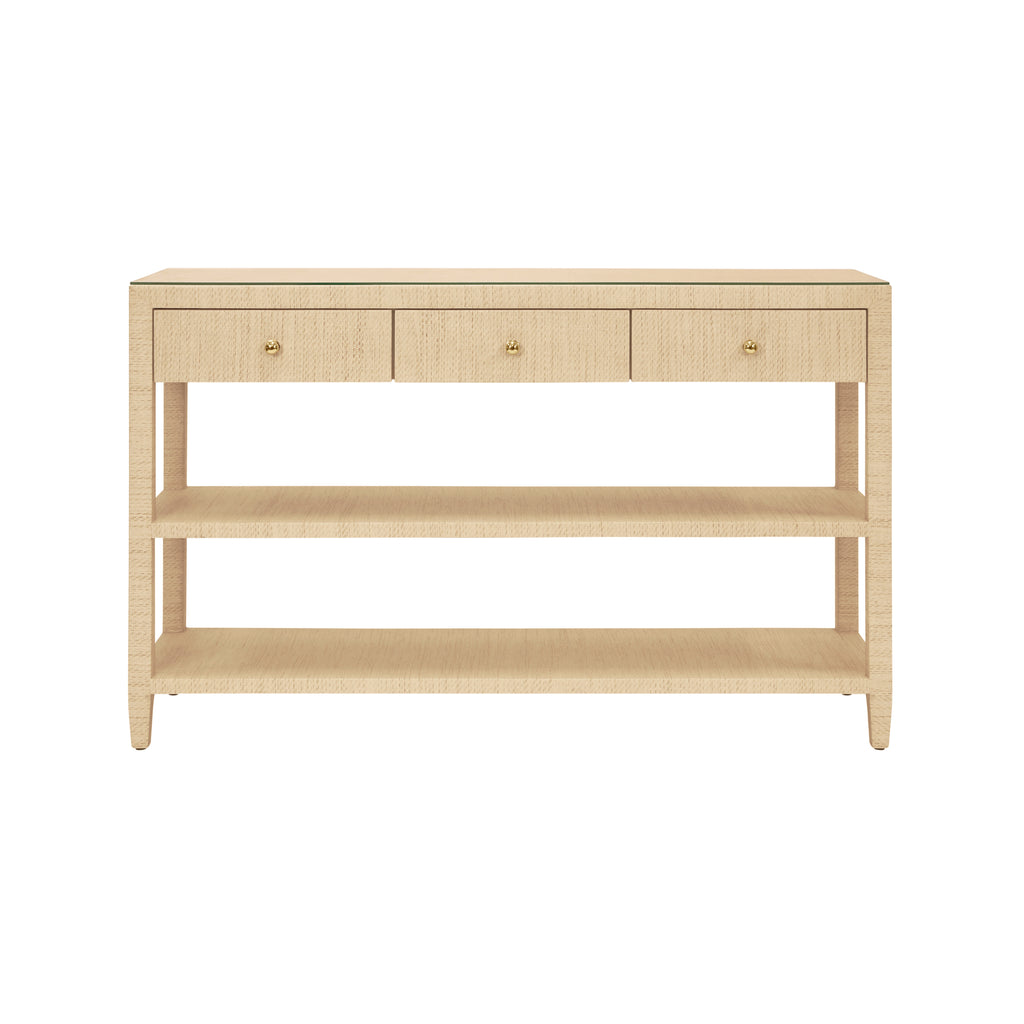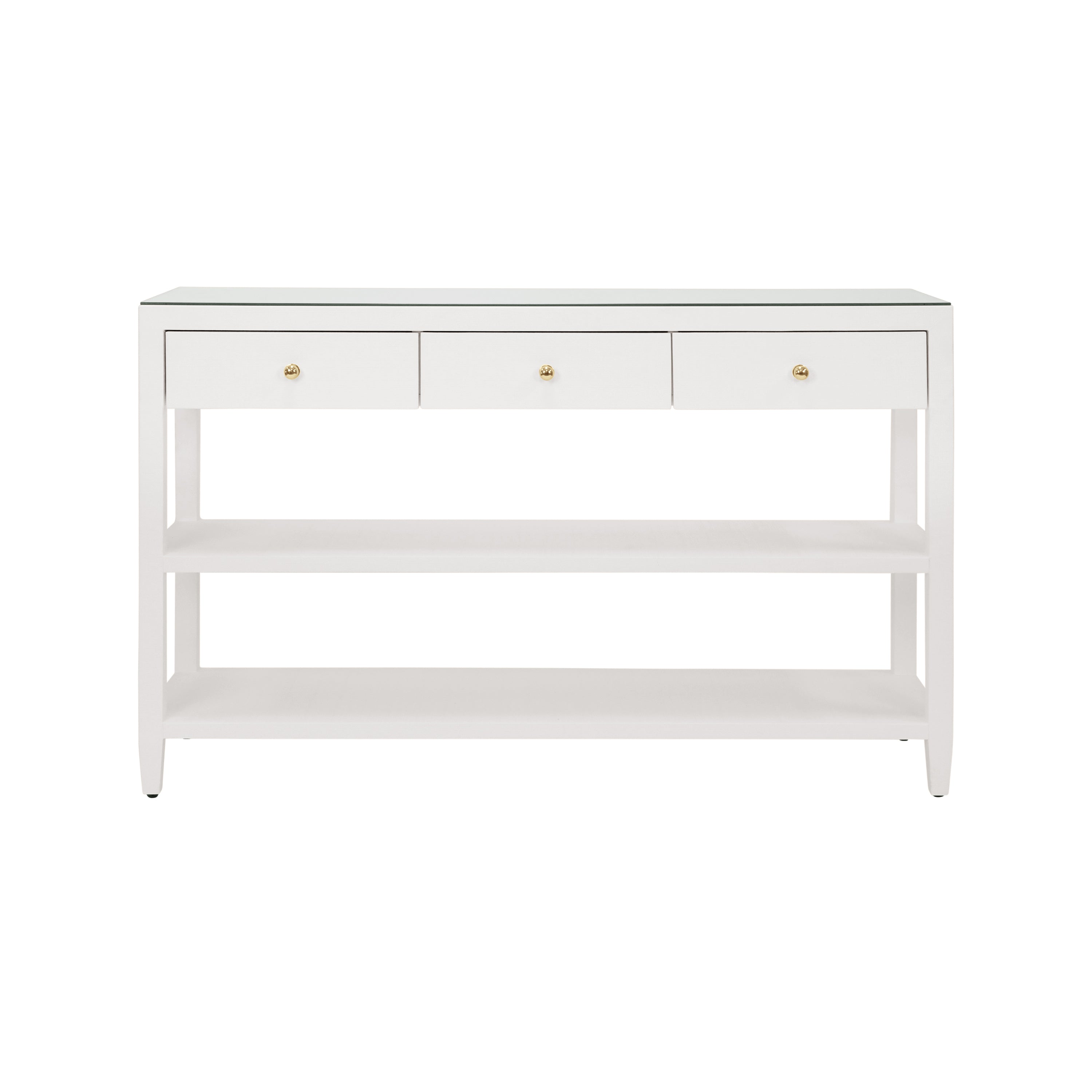 Blending elegance with functionality, this three-drawer console features two open shelves for versatile storage and display. The glass top adds a sleek, contemporary touch, while polished brass knobs elevate the design with subtle sophistication.